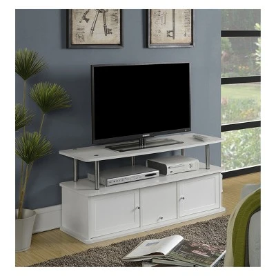 Upgrade your entertainment space with the Designs2Go TV Stand with 3 Storage Cabinets and Shelf, by Breighton Home. This TV stand is every movie lover’s dream with three large storage cabinets that offer plenty of space to store DVDs, gaming controllers, and much more. Two tiers of spacious shelving offer additional room for a cable box, router, gaming consoles, and even décor. This unit is engineered from woodgrain veneer, particleboard, and sturdy stainless-steel poles that will not rust with proper care. Little time will be wasted putting this unit together thanks to its easy set-up design. Add more convenience to your home from the Designs2Go Collection from Breighton Home, each sold separately.
