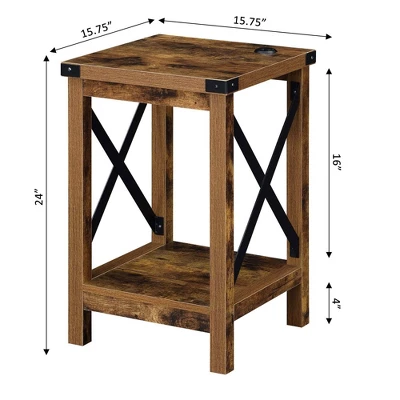 Add functionality to your industrial styled home with the Durango End Table with Charging Station with Shelf by Breighton Home. Featuring a built-in charging station on the tabletop surface for easy accessibility. The charging station includes two USB ports which can easily charge your phone or tablet. The versatility of the exposed built-in station allows for multiple devices to sit on the tabletop without the damaging or twisting of cords. The power supply cord is 6 feet in length giving you the room you need to display your end table where you choose. Includes a bottom shelf great for books; display; or additional storage. Engineered from particleboard and powder-coated metal; this piece is built to last. Pair with more beautiful items from the Durango Collection by Breighton Home; each sold separately.